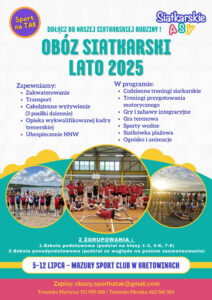 Zapraszamy na Letni Obóz Sportowy – Siatkarskie ASy, który odbędzie się w wakacje. Zgrupowanie jest skierowane do uczniów klas 1-3 i 4-8 szkół podstawowych oraz dla uczniów szkół ponadpodstawowych. Dzieci i młodzież trenują i spędzają czas niezależnie w swoich grupach wiekowych.
